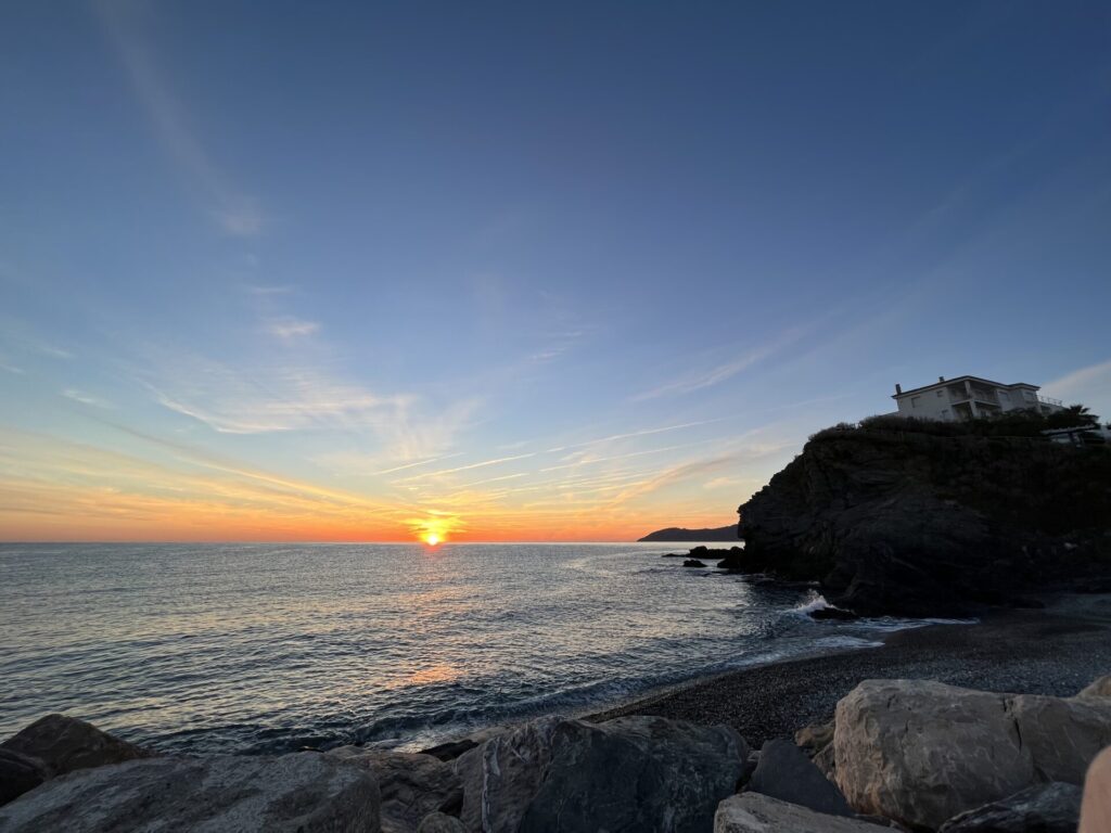I am not sure that my sister knew what she agreed to when she said she would wake up to see the sunrise, as our hotel window was facing east and it would be easy to see from our room. She soon found out, however, that I meant that we had to get out of bed, get dressed, and go down to the dark, chilly, rocky beach outside of our hotel to really see the sunrise. It started out as one of those “iffy” sunrises- is this going to be good? Was it worth it to get up early? Indeed it was – the sky rewarded us as it turned from black to navy blue to purple to bright orange.